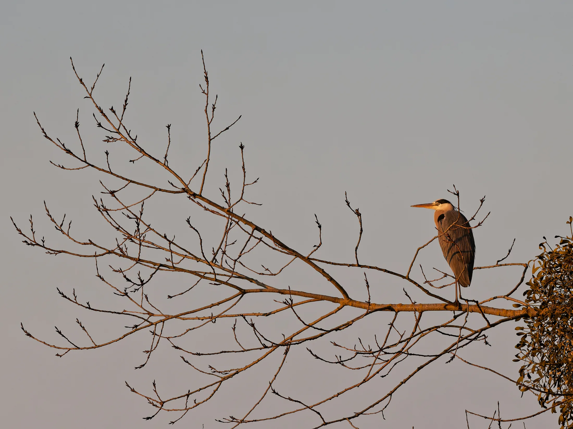 Als die gegenüberliegende Pappelreihe Schatten auf die Uferböschung warf, war es wohl für den Baumschupser an der Zeit, einen Snack zu sich zu nehmen. Er drehte sich um und machte sich über den kleinen Busch her, der an der Uferböschung Fuß gefasst hatte. Auch für mich war Zeit, sich umzudrehen. Auf dem Rückweg konnte ich noch den Sonnenuntergang genießen.