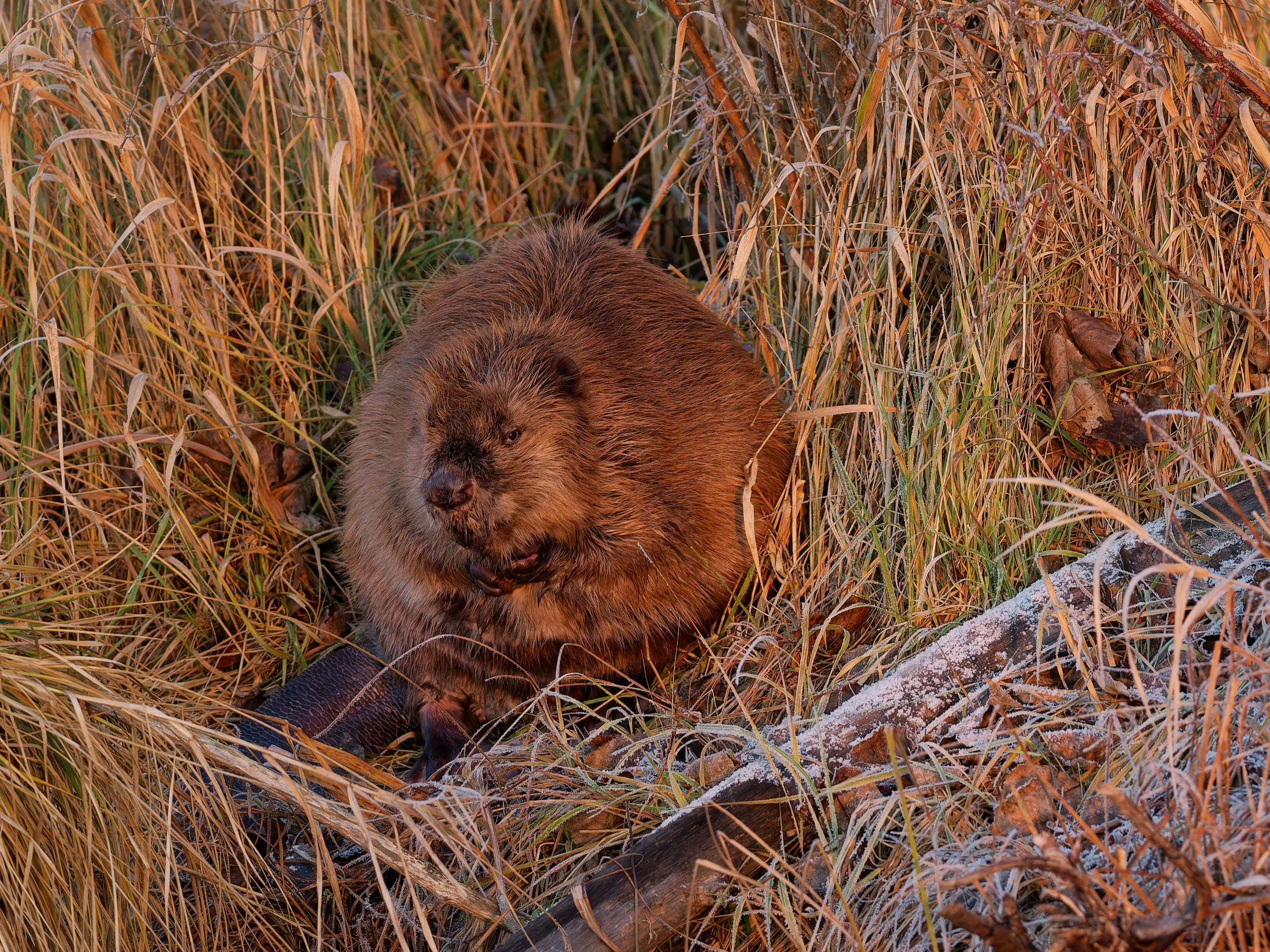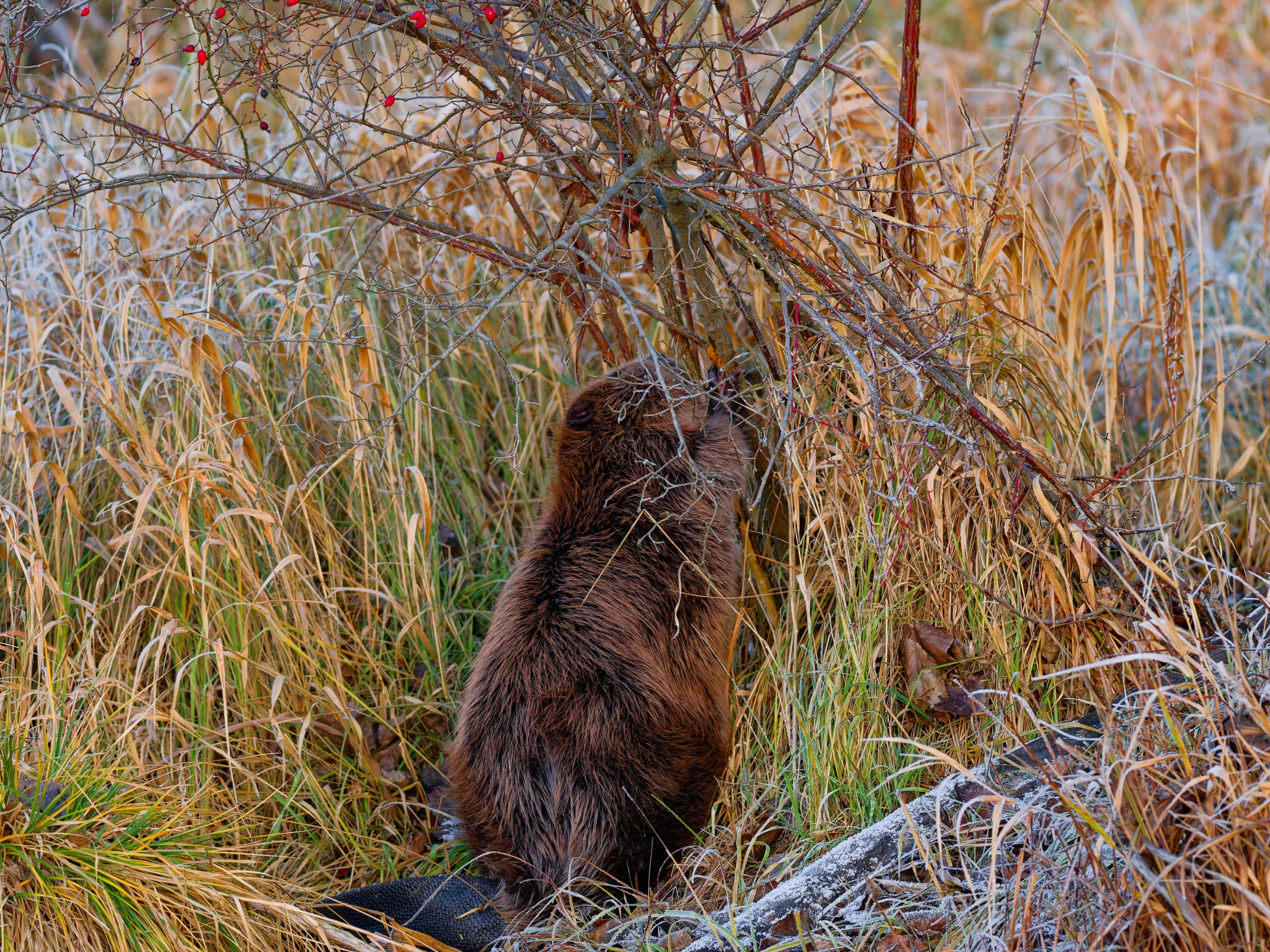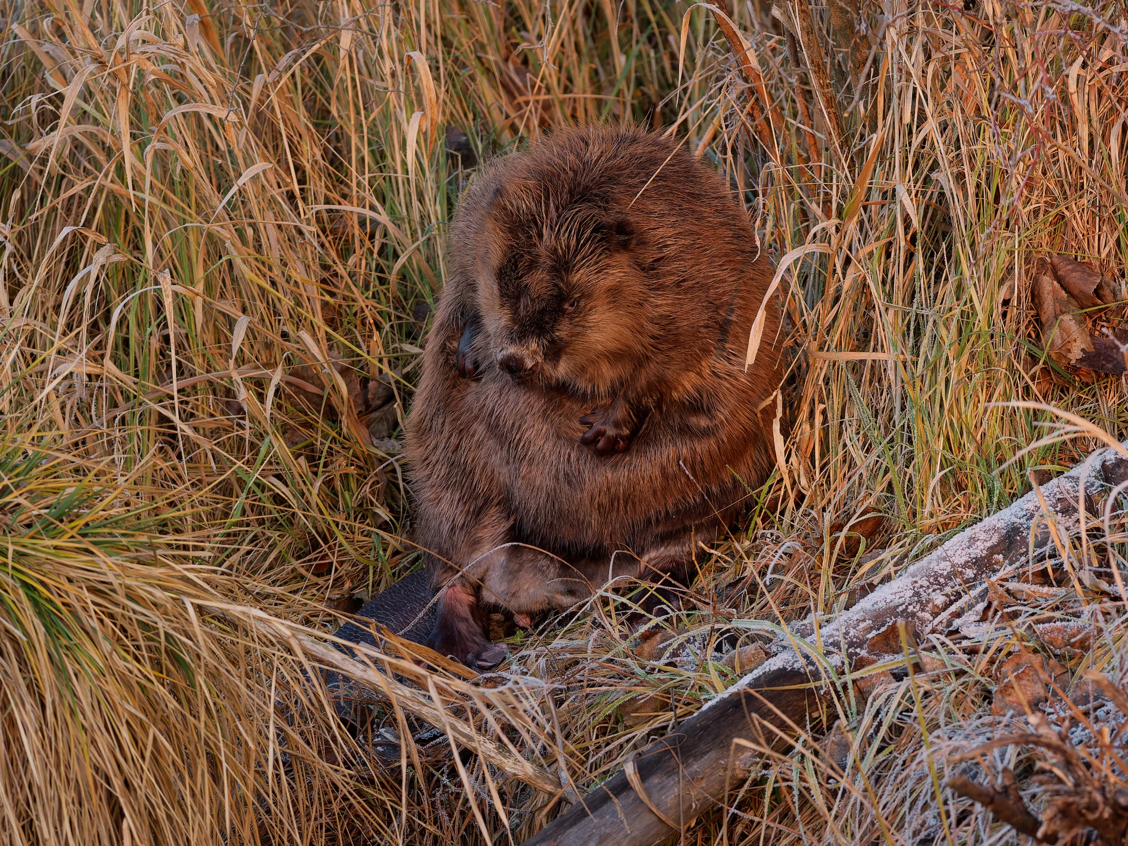 Ich brauchte gar nicht weit zu gehen, da begrüßte mich ein Graureiher, der sich in der Sonne badete. Ich verweilte ein paar Minuten und ging weiter, was dem Graureiher nicht behagte. Er stieg auf und verschwand mit einem lauten Krächzen in den Wiesen. Als ich die Brücke hinter mir ließ, sah ich auf der gegenüberliegenden Böschung einen stattlichen Biber sitzen, der sich ausgiebiger Fellpflege hingab.