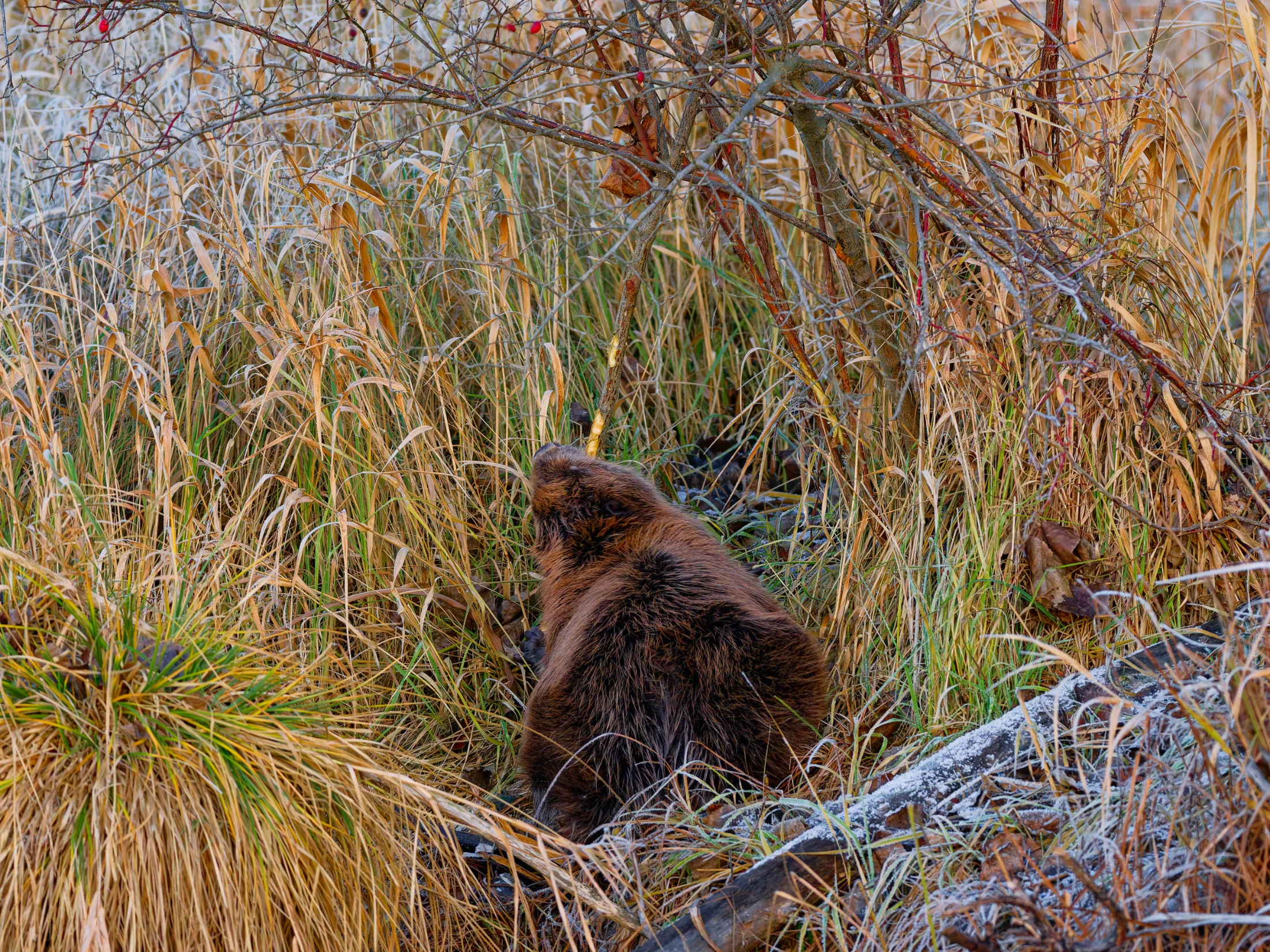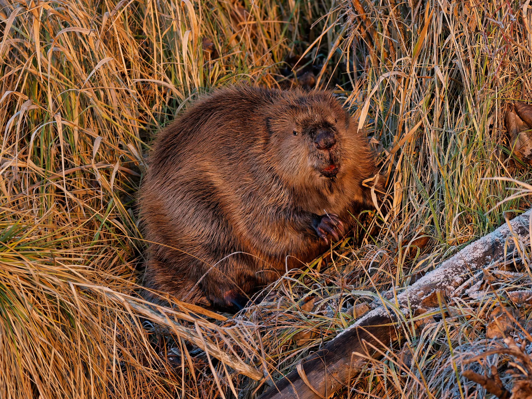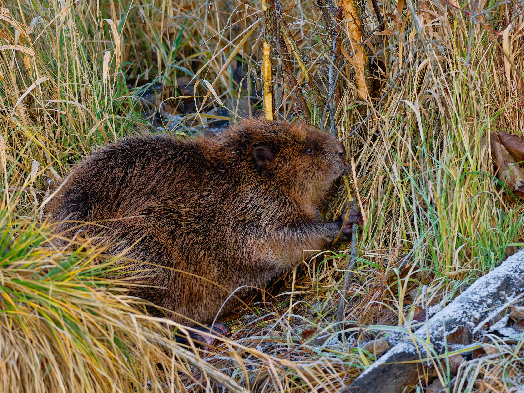 Ich brauchte gar nicht weit zu gehen, da begrüßte mich ein Graureiher, der sich in der Sonne badete. Ich verweilte ein paar Minuten und ging weiter, was dem Graureiher nicht behagte. Er stieg auf und verschwand mit einem lauten Krächzen in den Wiesen. Als ich die Brücke hinter mir ließ, sah ich auf der gegenüberliegenden Böschung einen stattlichen Biber sitzen, der sich ausgiebiger Fellpflege hingab.